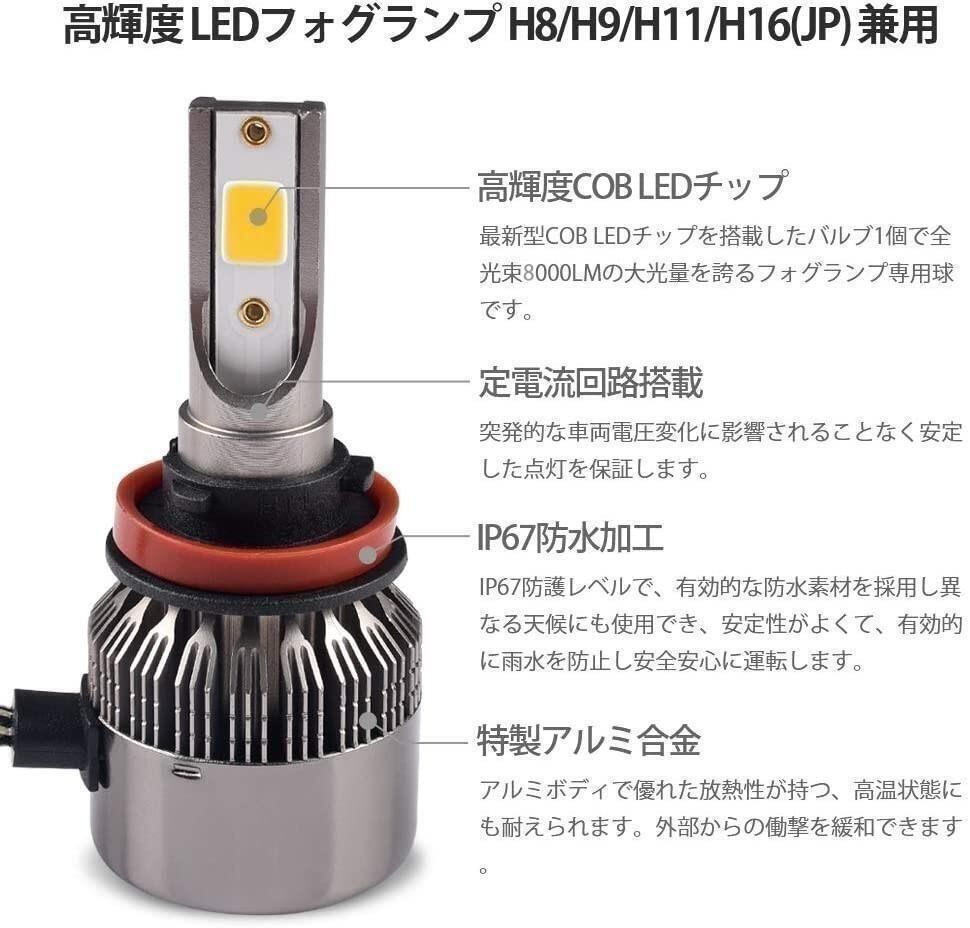 【製品仕様】口金タイプ:H8 / H9 / H11 / H16(国産車)、消費電力:55W×2、入力電圧:DC 12V、ルーメン:8000LM×2 合計16000LM、発光色:黄色、色温度:3000K、チップ採用:COBチップ、シェル素材:アルミニウム合金、防水等級:IP67(雨の日も安心です)